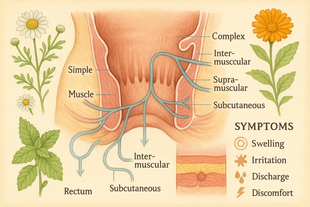 • فیستول ساده: مسیر کوتاه و کم‌عمق که به راحتی درمان می‌شود.