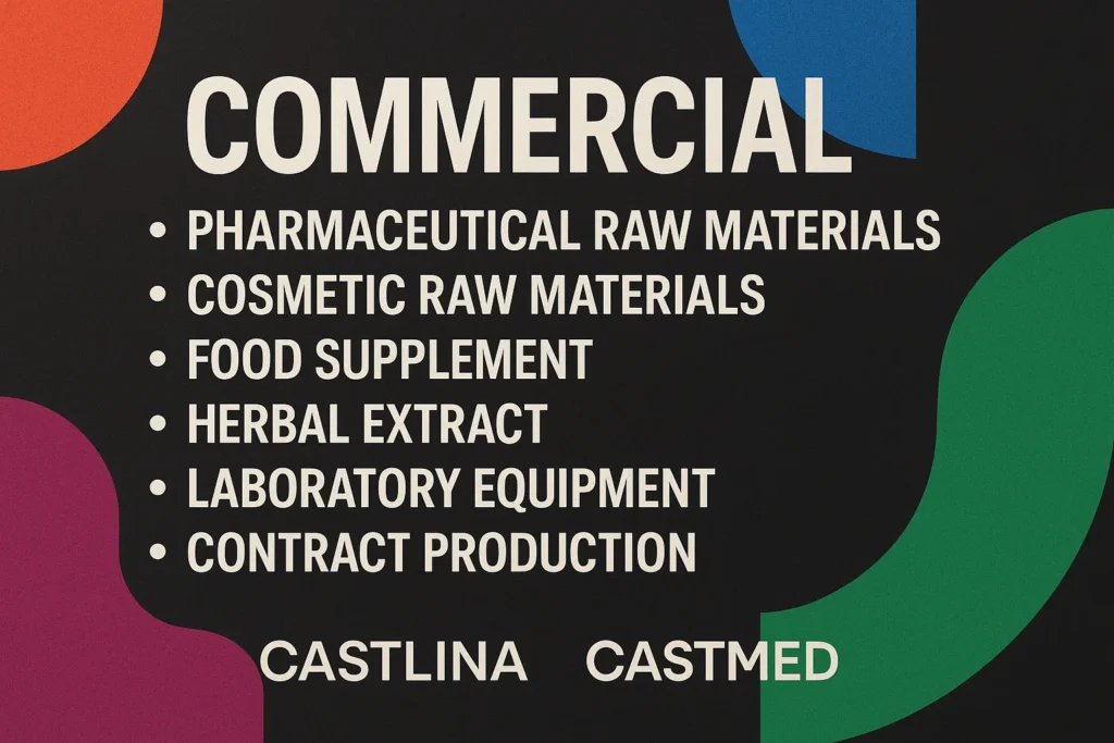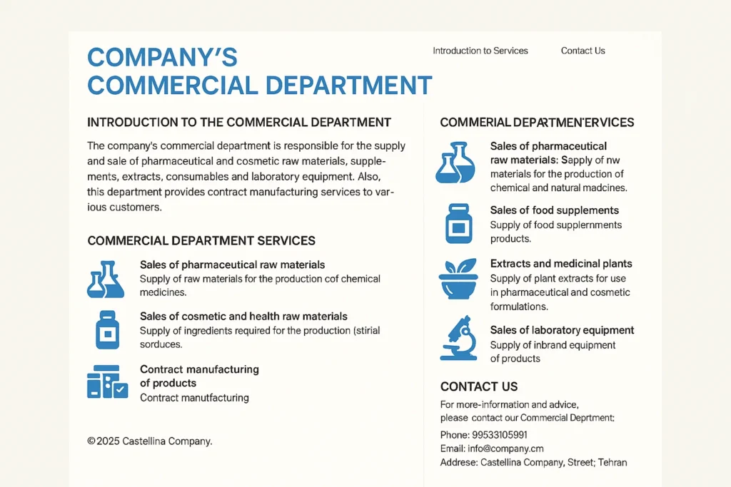 بخش بازرگانی شرکت مسئولیت تأمین و فروش مواد اولیه دارویی، آرایشی، مکمل‌ها، عصاره‌ها، ظروف مصرفی و تجهیزات آزمایشگاهی را بر عهده دارد. همچنین، این بخش خدمات تولید قراردادی محصولات را به مشتریان مختلف ارائه می‌دهد.