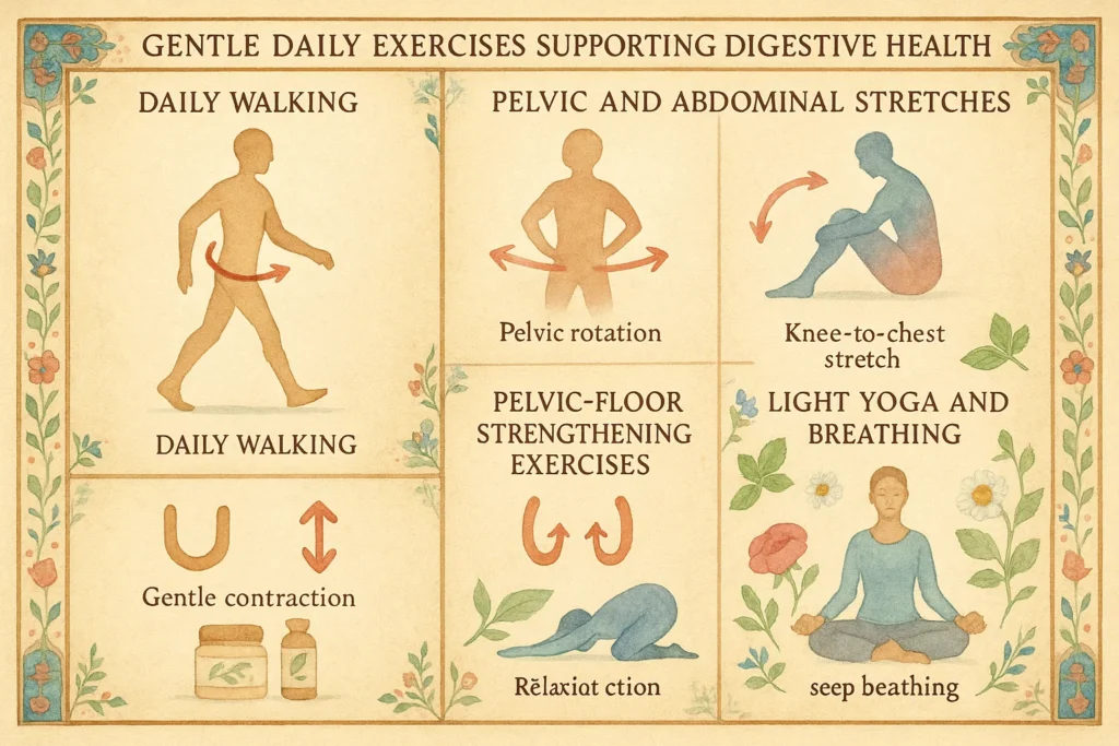 تمرینات سبک روزانه نقش مهمی در بهبود هضم، کاهش یبوست و کاهش فشار ناحیه مقعد دارند. با انجام حرکات ساده می‌توان سلامت گوارش و عملکرد دستگاه گوارش را بهبود داد.